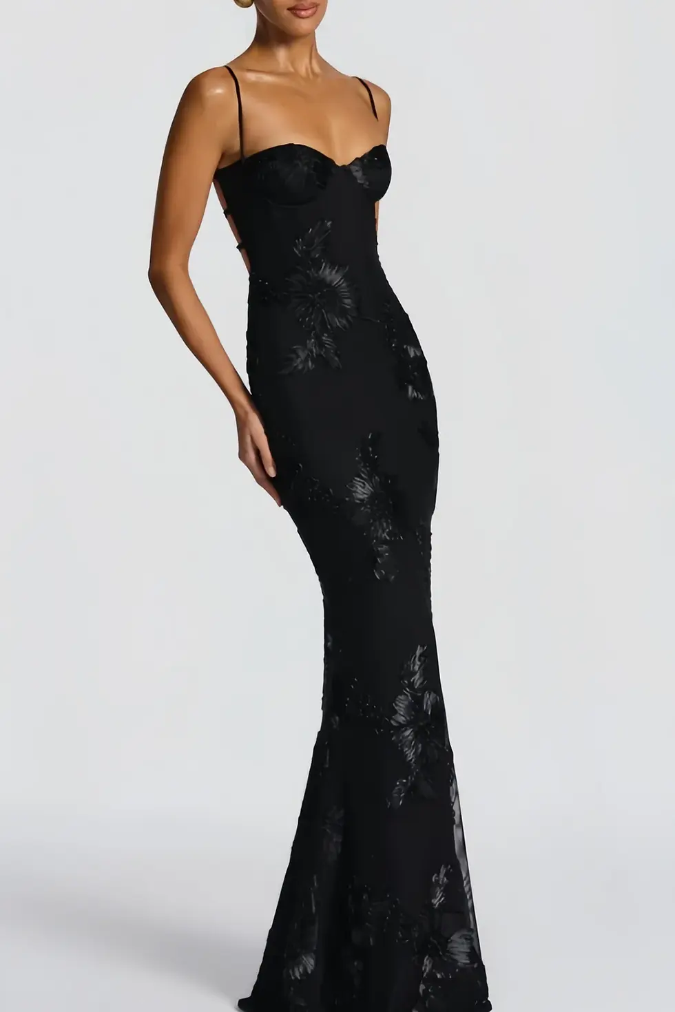 VESTIDO NEGRO LARGO CON MANGA CAÍDA Y TRANSPARENCIAS