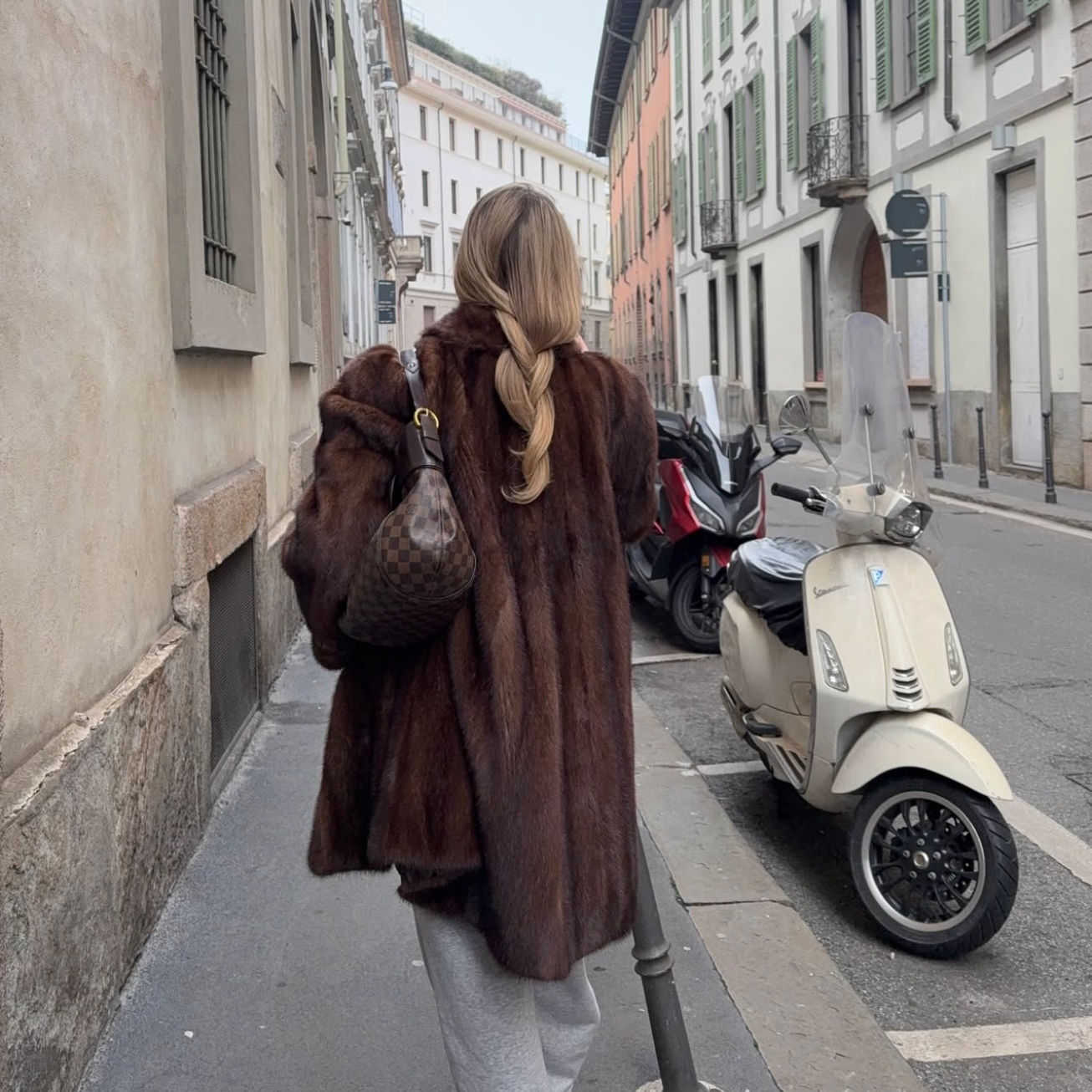 Abrigo confeccionado en visón genuino de alta calidad en tono café , diseñado para ofrecer una silueta sofisticada, elegante y atemporal.