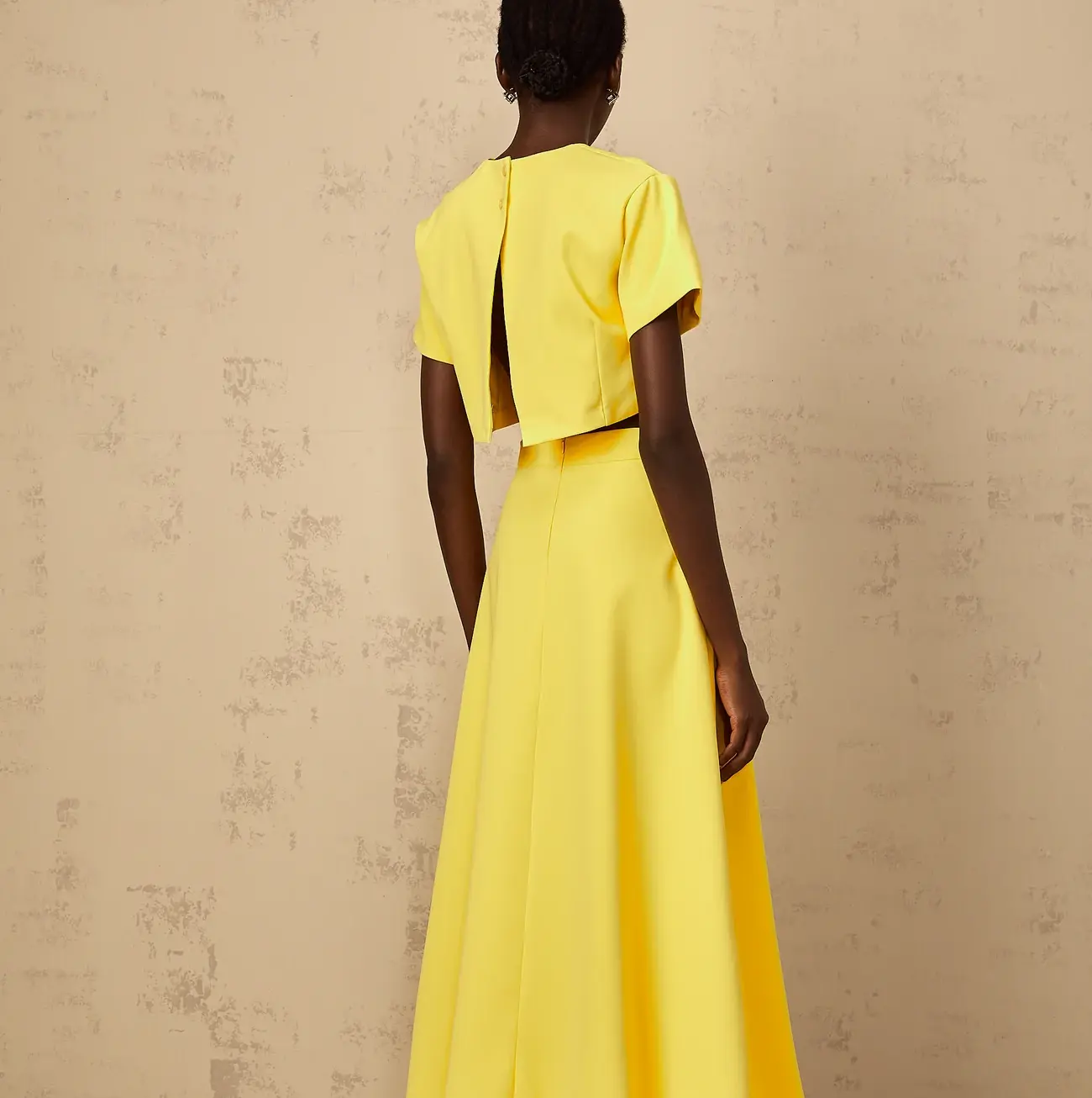 El conjunto IRÈNE está confeccionado en una base suave con bordado floral en lentejuelas que aporta brillo sutil y movimiento. Su color amarillo claro ilumina la silueta, haciéndolo ideal para eventos de día, bodas o celebraciones elegantes.