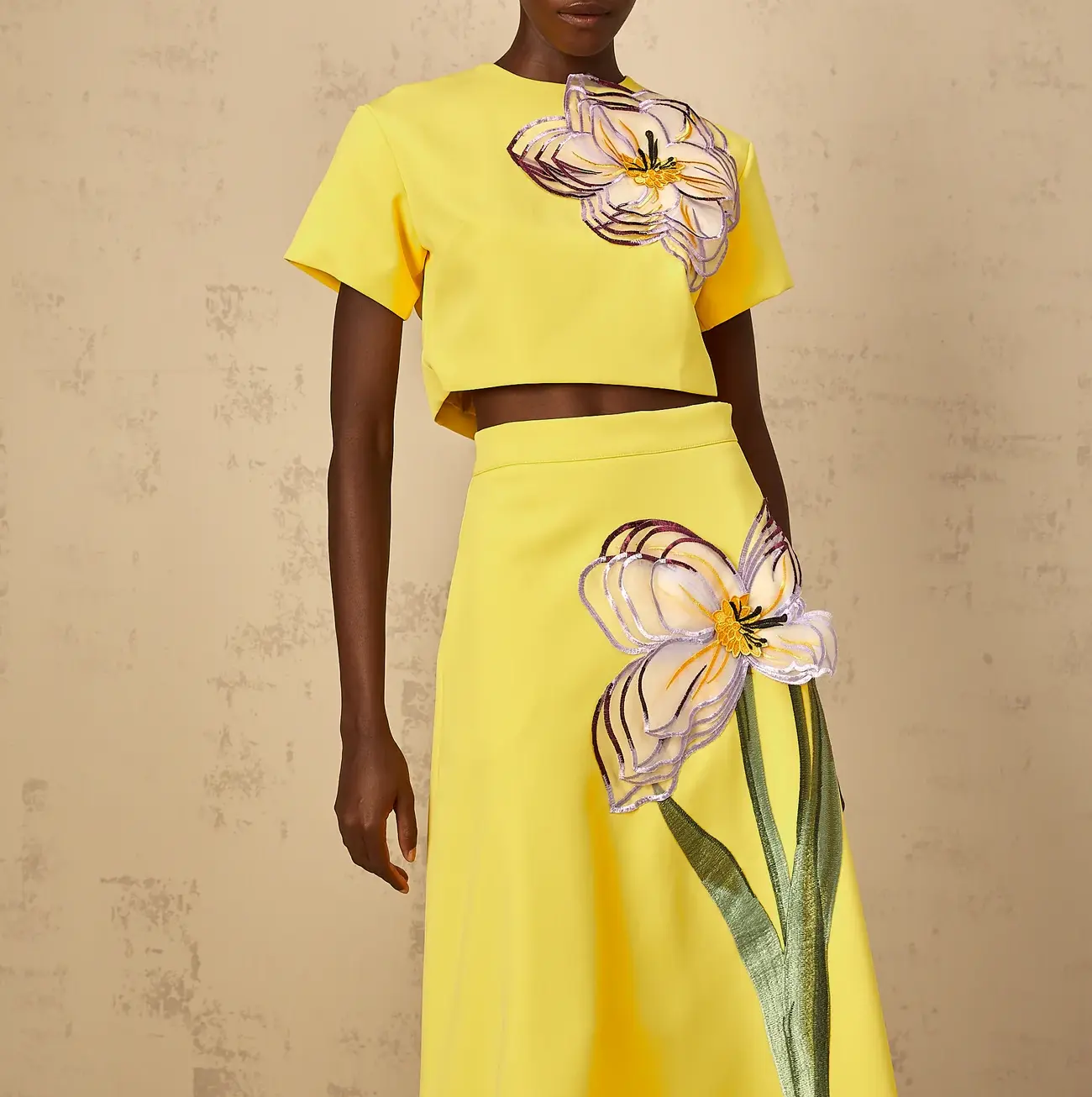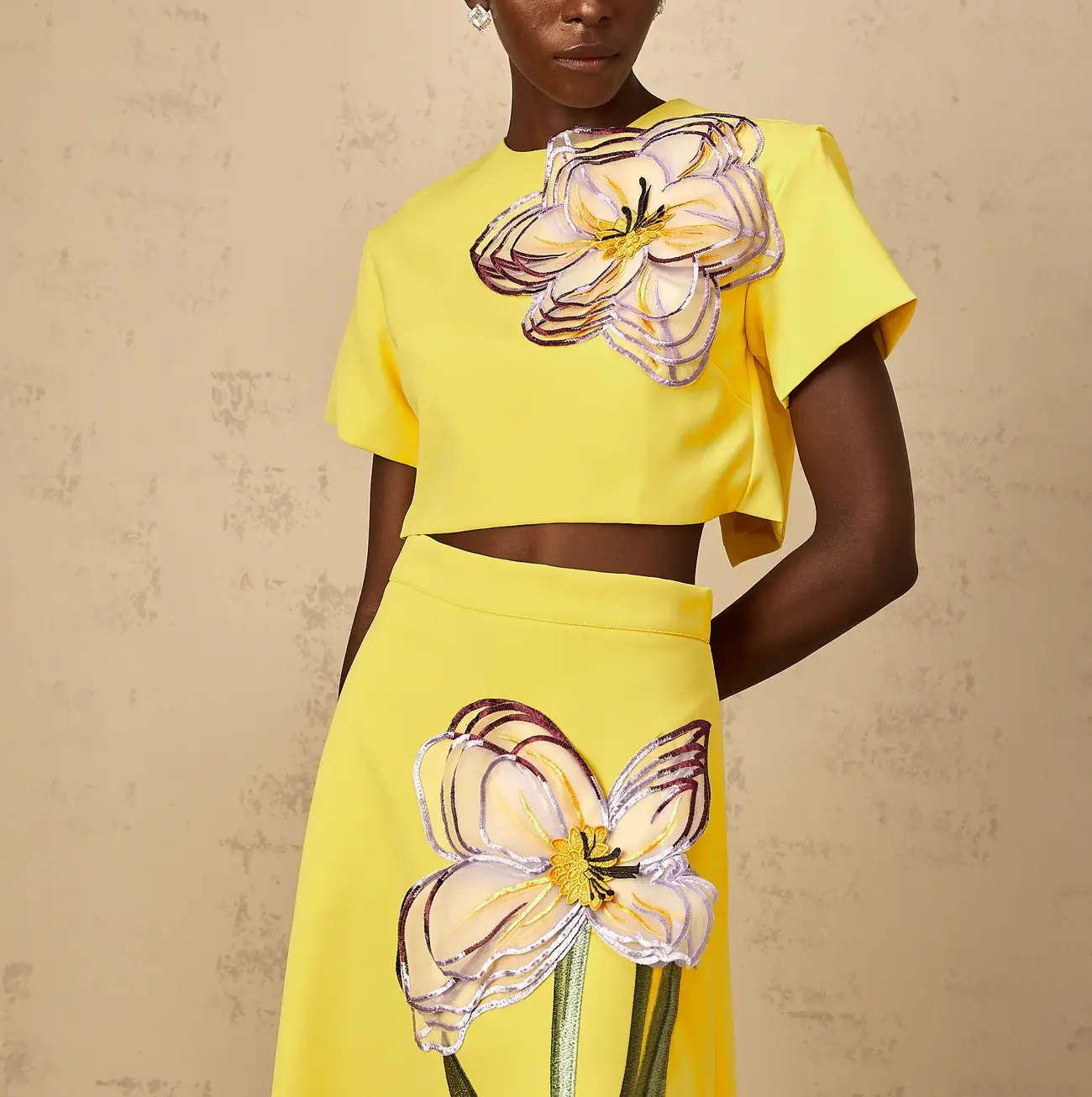 Conjunto Aurora bordado con lentejuelas y flores en tono amarillo