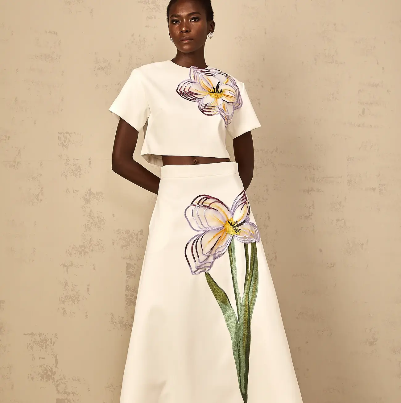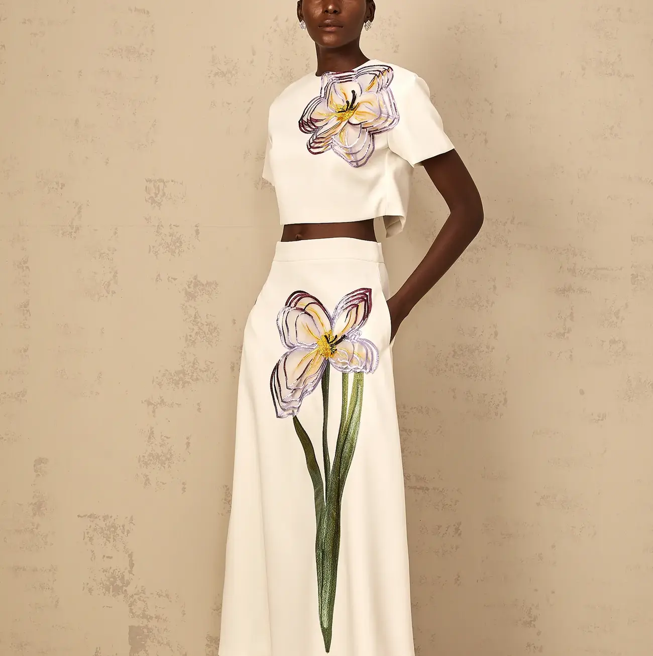 El conjunto Aurora está confeccionado en una base suave con bordado floral en lentejuelas que aporta brillo sutil y movimiento. Su color blanco ilumina la silueta, haciéndolo ideal para eventos de día, bodas o celebraciones elegantes.