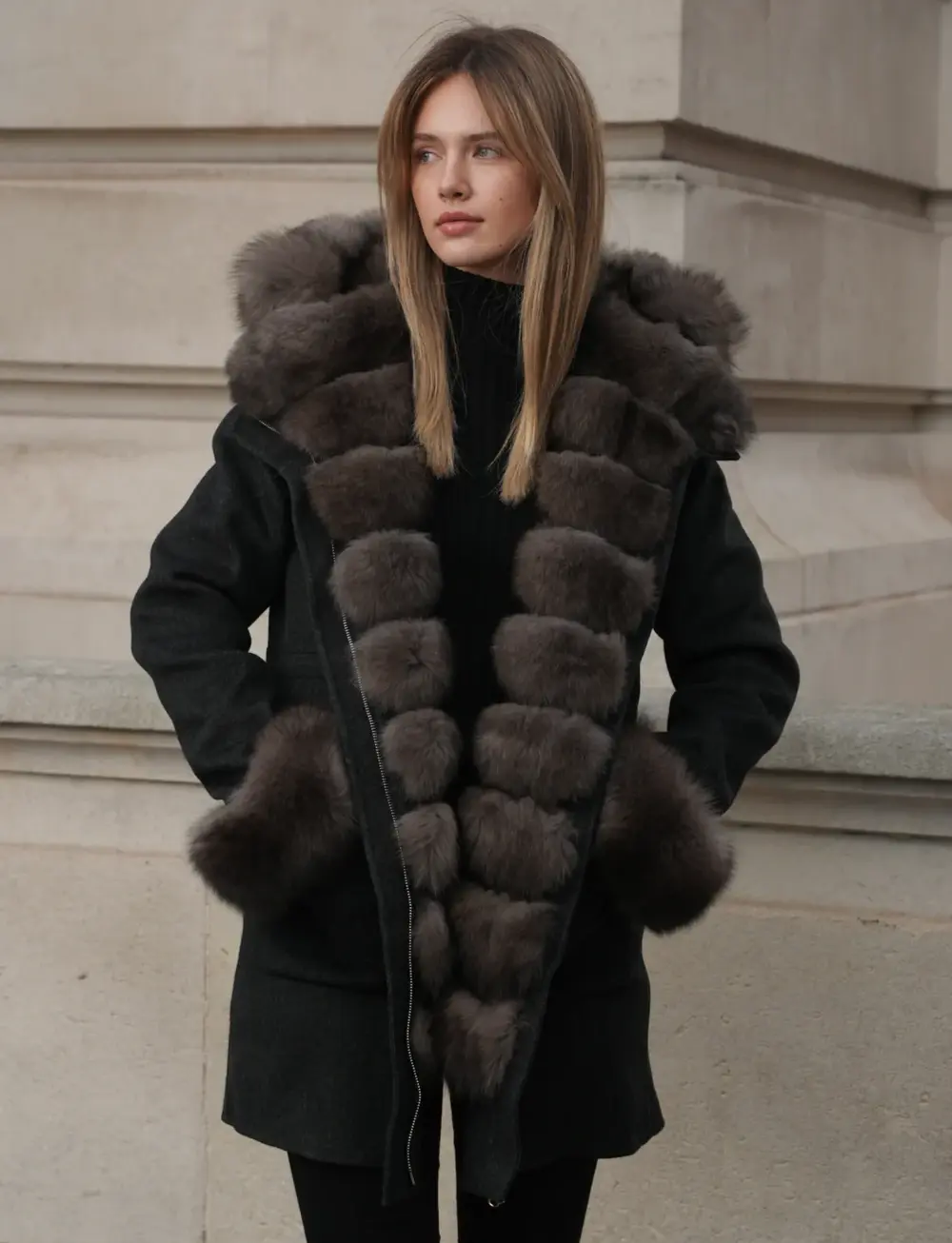 Abrigo de lana gris oscuro, con forro de piel de zorro extraíble. El abrigo para viene con una capucha grande y cómoda también forrada con piel de zorro.