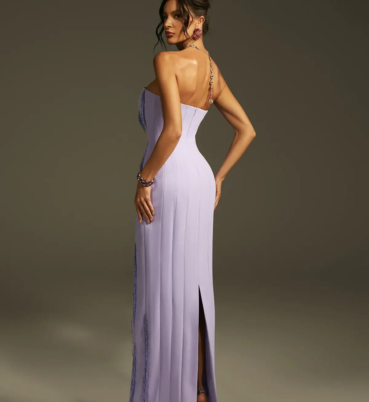 LORENA VESTIDO MAXI EN TONO MORADO CON DETALLES DE FLECOS Y BRILLOS