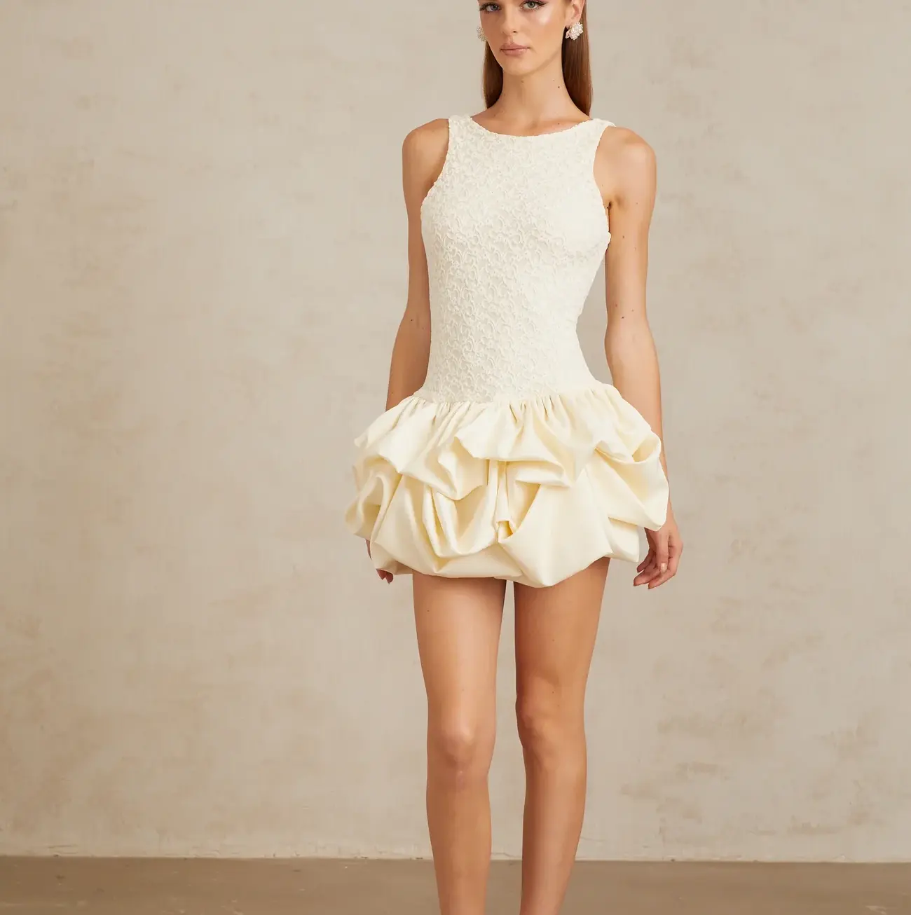 Vestido Isadora en Tono Neutro con Encaje Floral en Relieve y Detalle Abombado