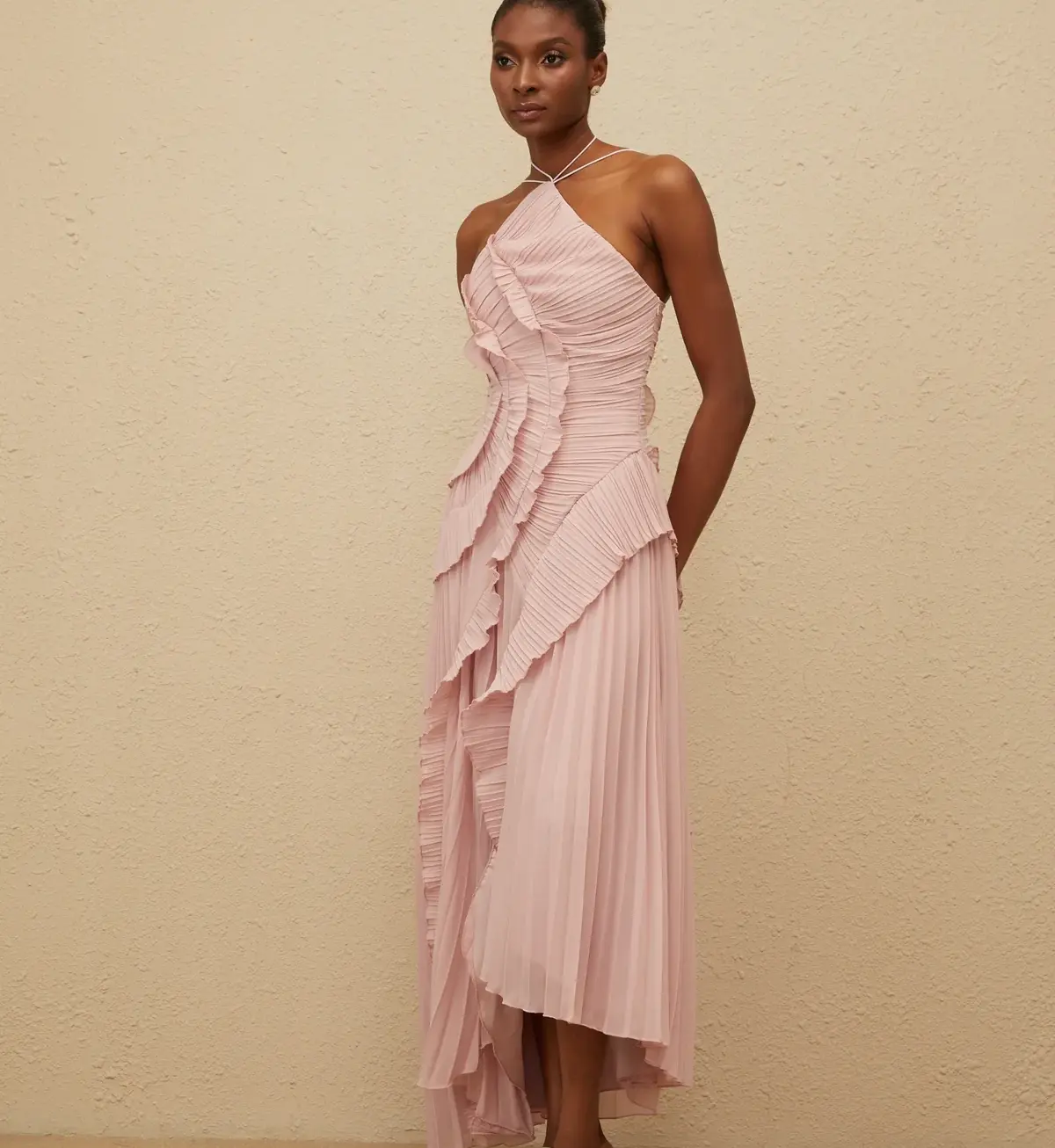 Vestido Rosa Midi con Olanes y Plisado