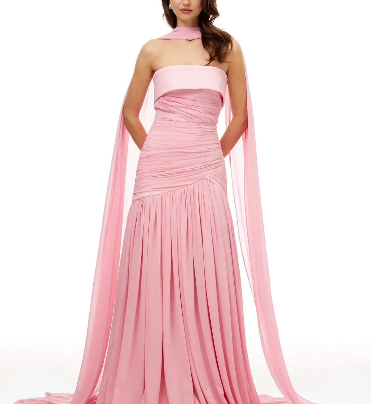 Vestido Rosa Strapless Con Accesorio en Cuello