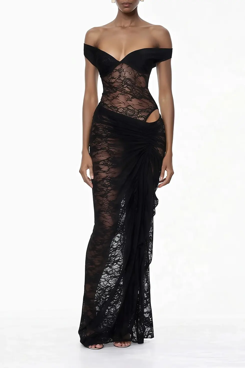 Vestido Negro Transparente y Acccesorios Dorados